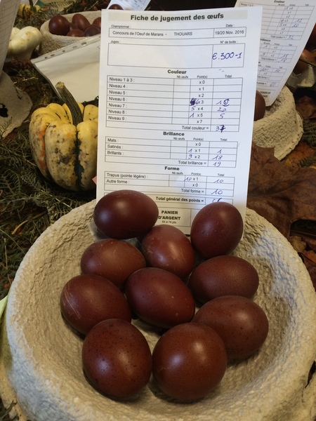 In French poultry shows Marans often compete in two distinct categories: eggs and exhibition. In the egg category, the eggs of black copper Marans are judged for the depth of their brown color, luster in the shell color, size, shape, and other factors aimed at producing the perfect Marans egg. In the exhibition category birds are judged on their body shape, coloration, and many other factors contained in a written standard that describe the ideal appearance for a Marans. Both of these categories are exhibited and judged at a national Marans show in France that we have attended several times and marveled at the quality of the eggs and the birds. To give you a better sense of this, pictured in the gallery below are egg pictures we took while at the French national show.